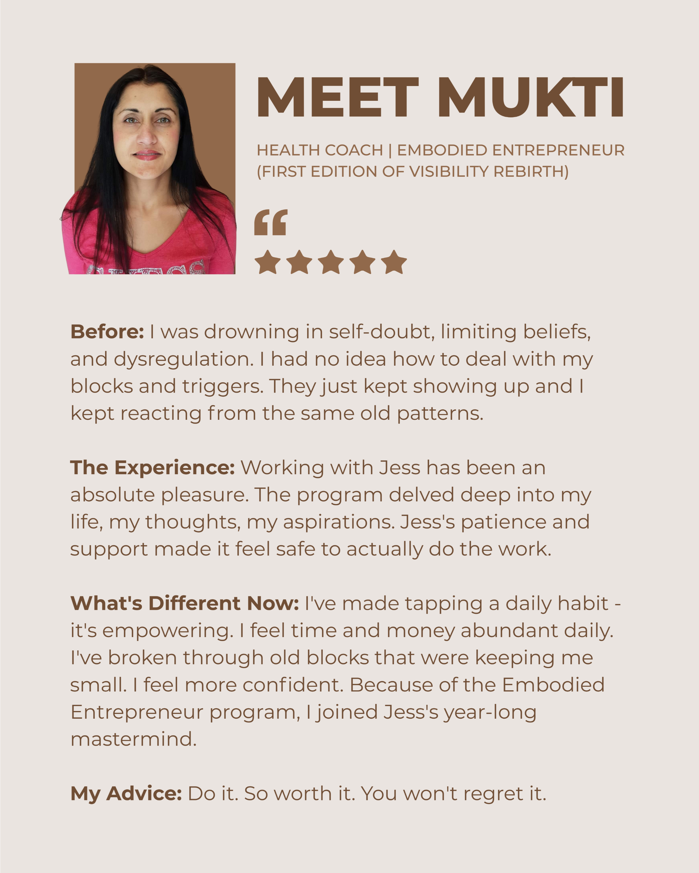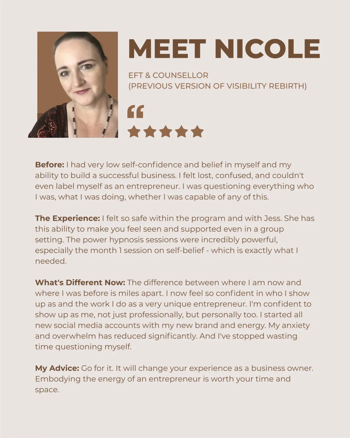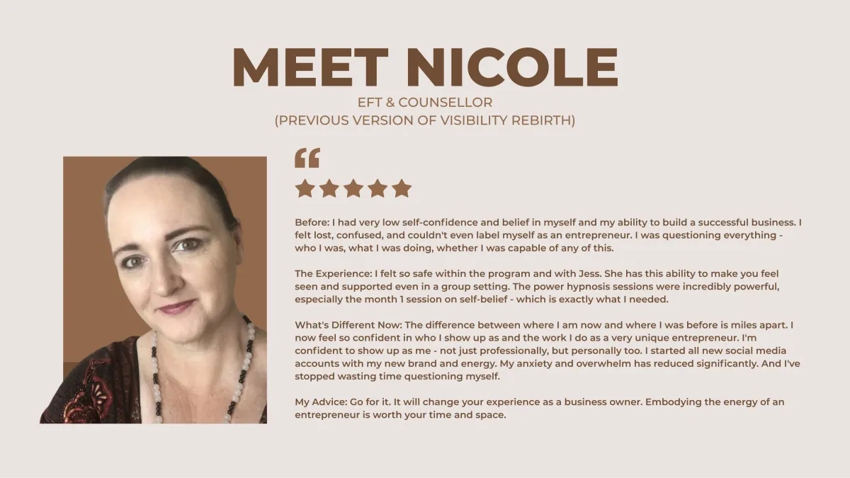 Visibility Rebirth is designed for women at every stage - including the beginning. Because the beginning is exactly when you need to anchor into the identity that will carry your business forward. You don't need to prove yourself first. You need to become her first. Then the results follow.
