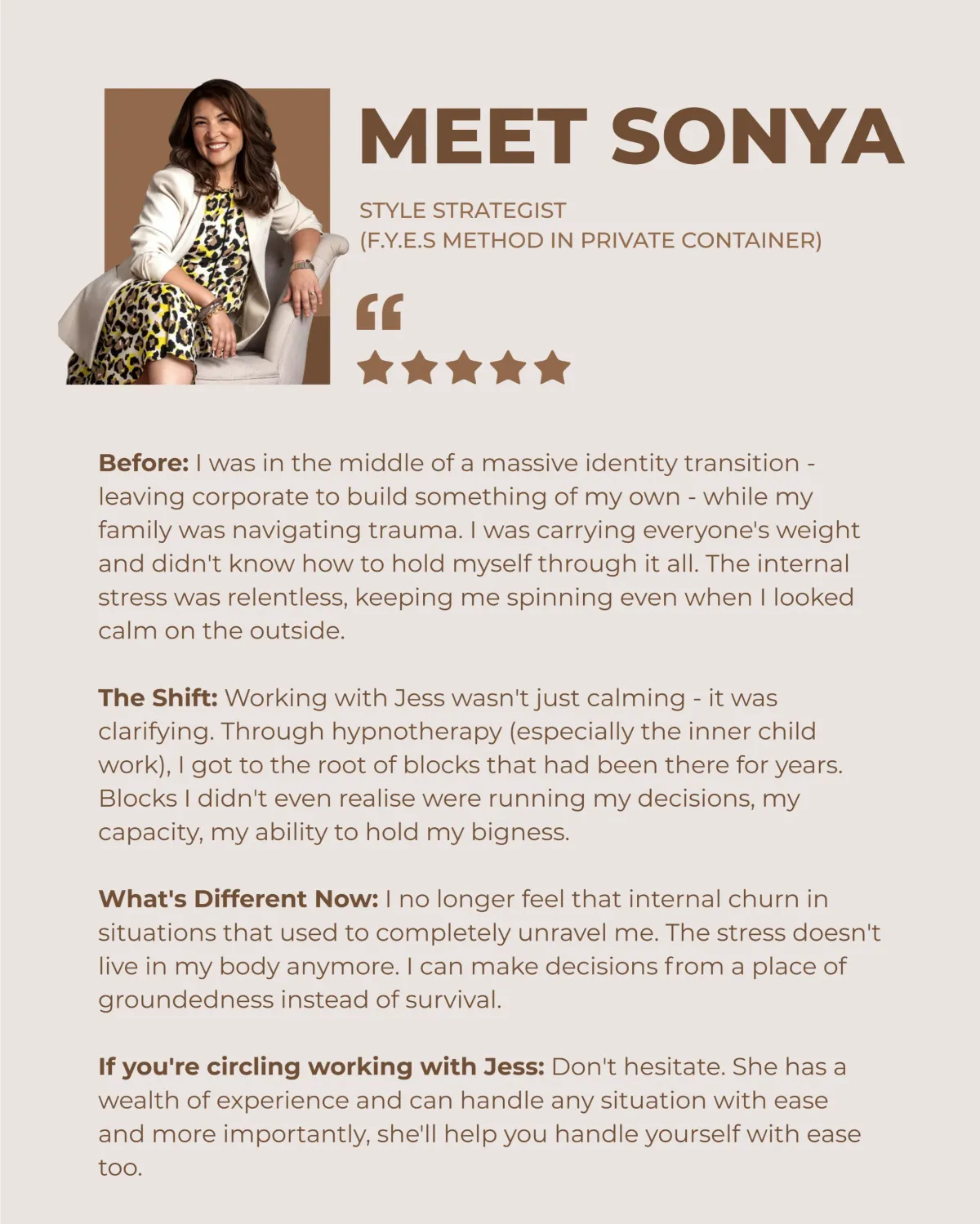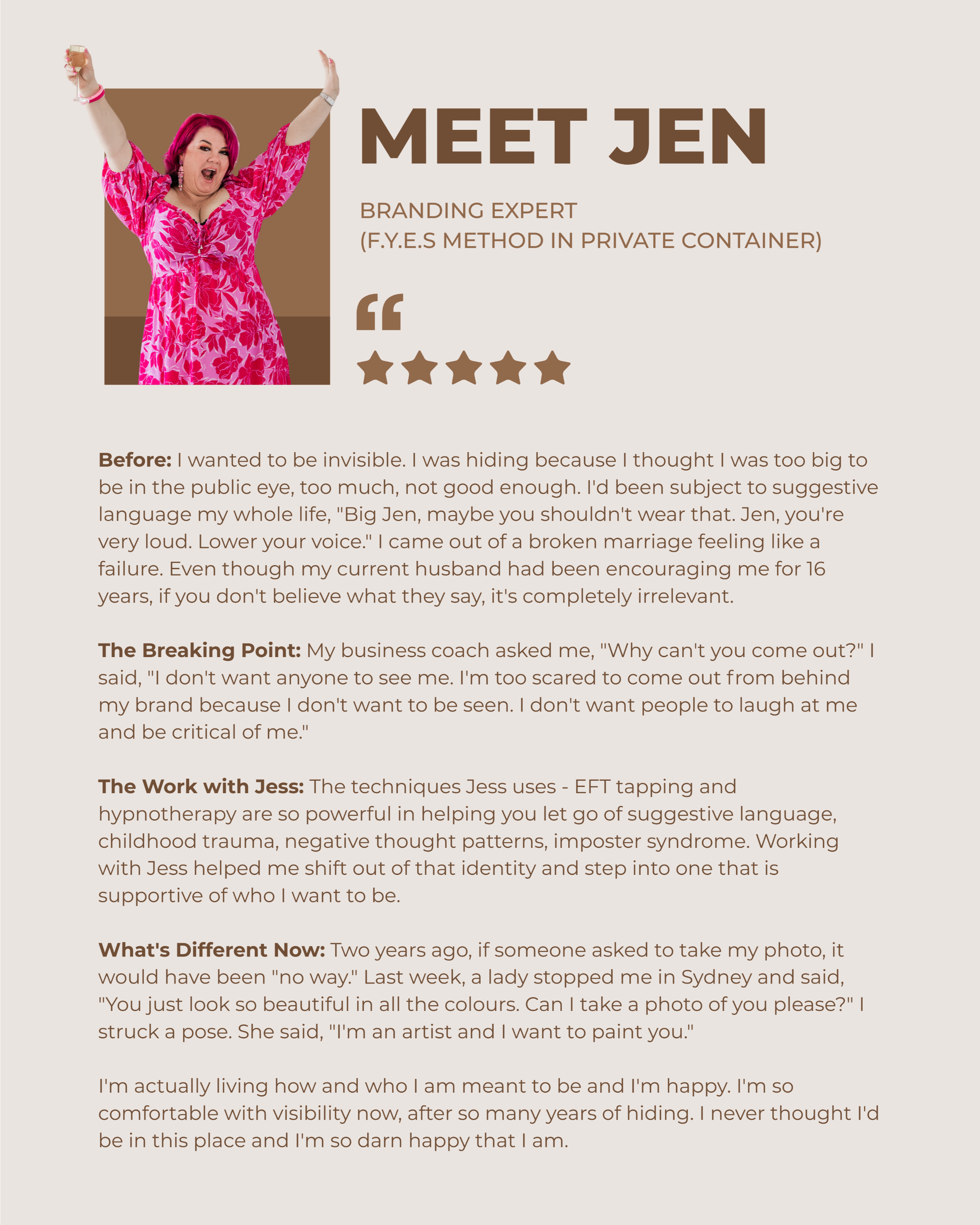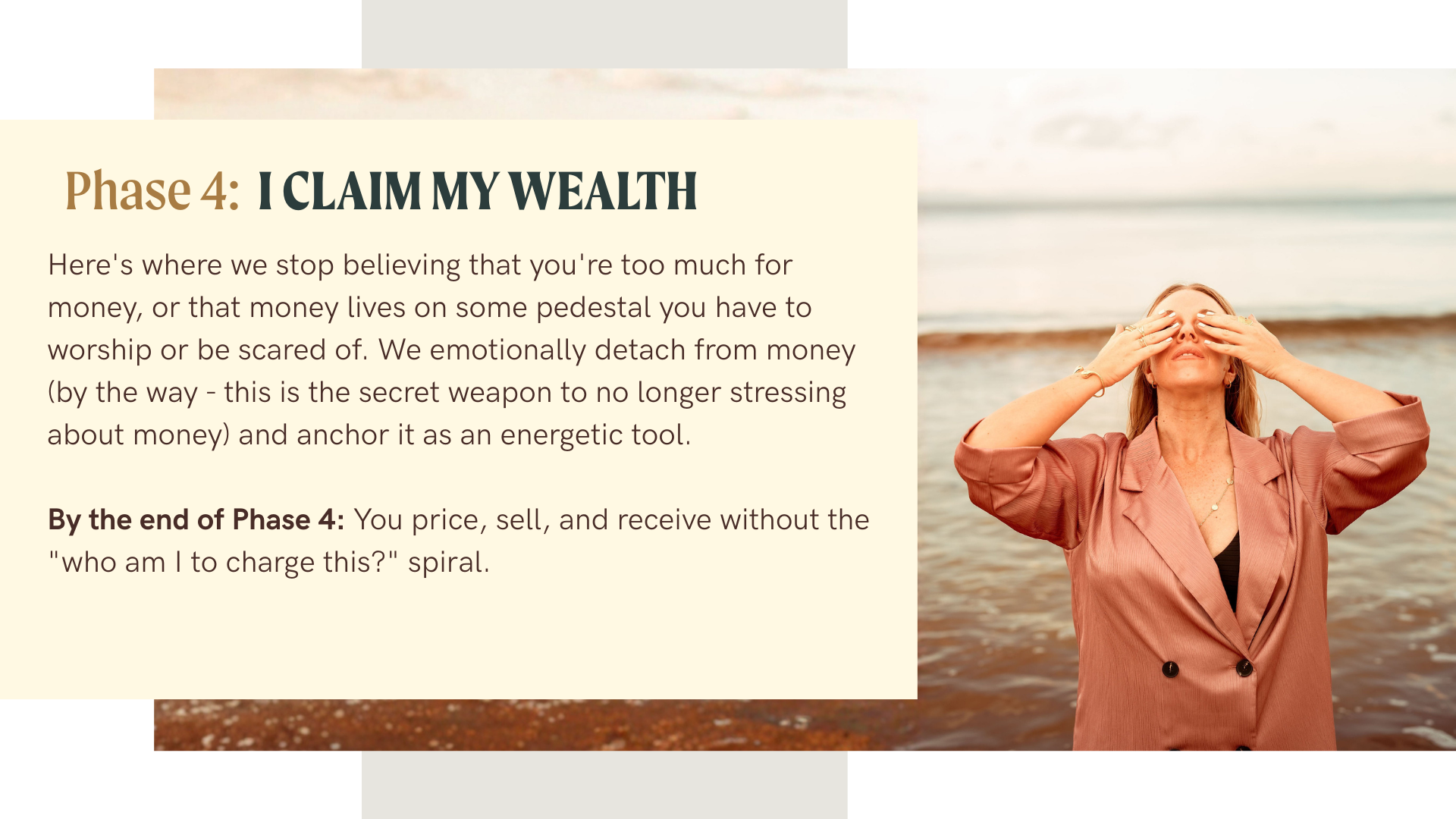 We move through the 5-phase F.Y.E.S. Method (Fully You, Expressed & Seen) to take from survival led-business, to embodied, un-shakable presence.