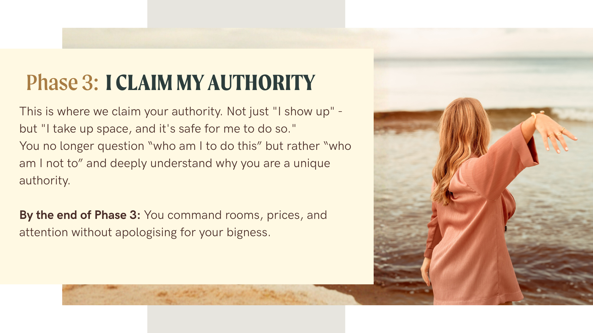 OBM, VA or creative running high-level strategy for others but hasn't anchored into her own authority yet - you're the quiet achiever who over-delivers to prove your value